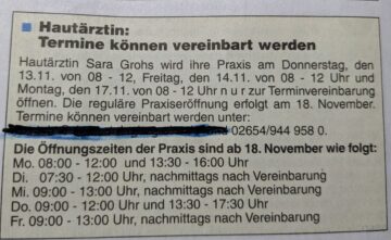 Am ersten Morgen erhielt die Praxis ca. 500 Mails zu Terminvereinbarungen. Deshalb bittet Sara Grohs um Verständnis, dass die Mails vorerst nicht beantwortet werden können. Alle, die einen Termin brauchen, mögen bitte anrufen unter 02654/9449580. Wenn besetzt, bitte ggf. mehrmals probieren.