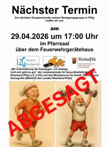 Senioren [Amtlicher Beitrag] „Ich bewege mich – mir geht es gut“ in Pillig Ortsbürgermeister Horst Klee Posted on 25. Apr 202625. Apr 2026 ABSAGE „Ich bewege mich-mir geht es gut“